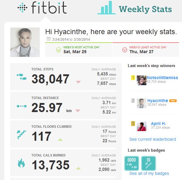 My FitBit stats from last week weren’t bad, either. A couple of slow days when I was at sewing class. I know that I have to move more. Gee, it sounds like I’m a broken record. I know what I have to do but I’m not stepping up and getting it done, yet. But I will. Life is good.