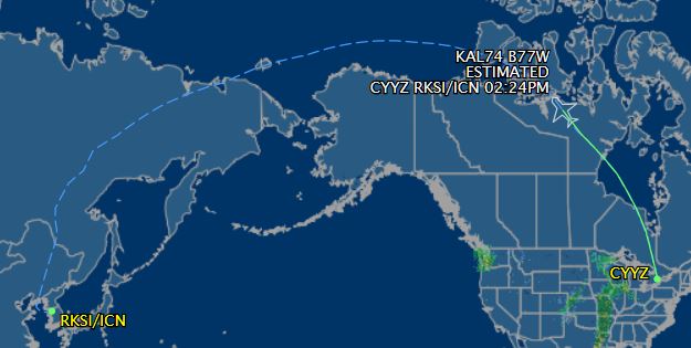 Next up, the final leg, was a thirteen hour flight which actually got us back to Toronto half an hour before we left Korea, thanks to the International Date Line. There was turbulence over Hudson’s Bay and the Arctic Sea, but not bad enough to stop food service. I’m fascinated by the looping polar route that took us over Russia and northern Asia – 11,302 km. Apparently, passenger aircraft are not permitted to be more than a certain distance from land. Comforting, I guess.