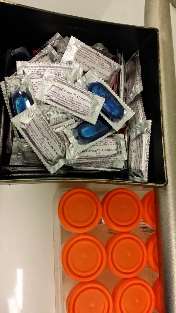 As I was leaving the doctor’s office, I detoured to the bathroom for a whiz. As I was drying my hands, I glanced at the assortment of items on the lid of the toilet, just in front of the grab bar screwed to the wall. I thought it an odd place to leave a bowl of candies, right beside the box of orange-topped urine sample containers. But nooooo. Not sweet treats but condoms. These were coloured and flavoured. Oh my. Not your every day Trojans.