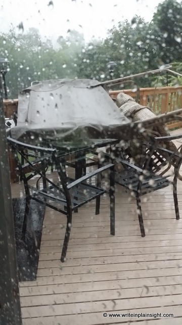 Silly me, I dialed the emergency number for Hydro One, to get an update on how long the outage might last. Part of their website hadn’t been updated since 2014. The outage map showed only a few hundred people affected with an expected repair time of 8″45. Do-able – we had lots of candles. When we pulled back the curtains to the patio door, we saw that the heavy swing had been smacked over the glass table and chairs and jammed against the barbecue. Luckily, nothing broke, but the rain was slashing down so hard we couldn’t get out to move anything.