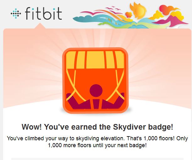 But hooray for me! I got another badge from FitBit. I am officially a floor climbing wizard of skydiver proportions! 1000 flights of stairs in about three months.