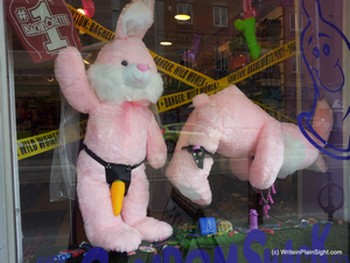 A group of us from the Conference straggled along Queen Street west to have lunch. Don’t remember where, but the place was loud and the service harried. Along the way, we passed a store – The Condom Shack – with a display that I had to stop and photograph. Talk about a story starter. I have a fertile imagination, but my goodness, the clever juxtaposition of stuffed pink rabbit sporting a carrot strap-on and that purple thingy under the submissive bunny made me stop in my tracks and burst out laughing. You never know when life is going to hand you a lesson, though.