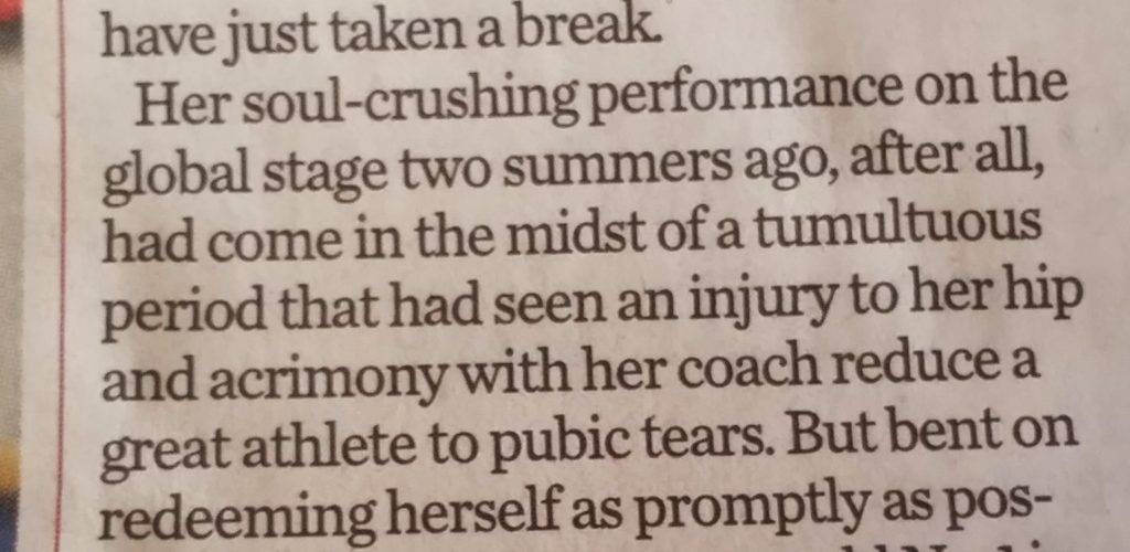 But heaven’s above, don’t they have readers who at least scan the copy before someone hits ‘send’? If I’d been the athlete and read this as I was trying to recover from a so-so performance on the track, I’d be bawling my eyes out and dabbing my eyes with tissue all over again.