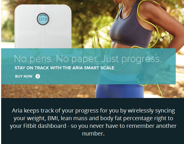 Gee wizzers. As soon as I start actively thinking about getting my unshrinking butt back into the weight loss track, I get an email from the FitBit folks telling me about their new personal weighing device – the ARIA™ WI-FI SMART SCALE. I can choose a colour (white/black), pay $129 USD and get a device that will track my weight, body fat percentage, and BMI then sync all of the statistics to my computer.