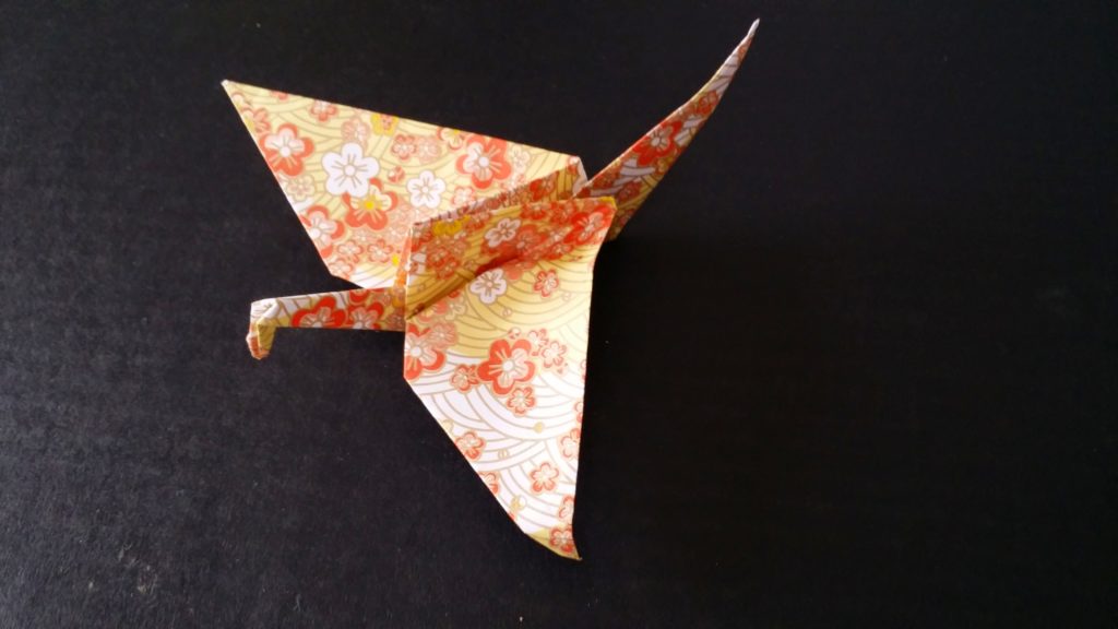 into her handbag and pulled out some coloured squares of thin paper. As I stared, open-mouthed, she deftly folded, turned, creased and unfolded a beautiful crane with outspread wings. She handed it to me with a small bow. I bowed as well. We clasped hands and smiled. No words were needed.